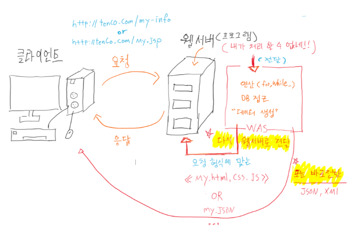 웹 서버가 못해 → 웹 애플리케이션 서버(WAS)이 처리함 ⇒ 동적 콘텐츠 생성