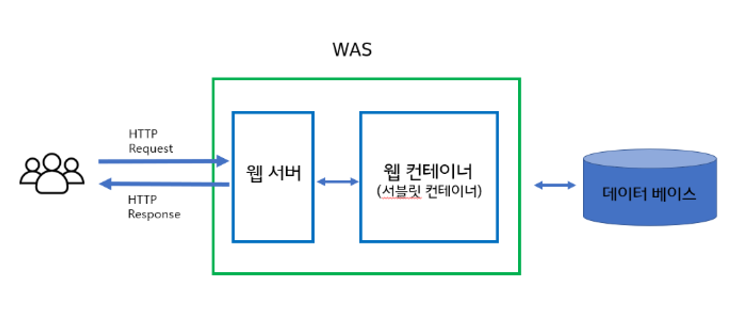 웹 애플리케이션 서버(WAS)는 웹 컨테이너를 포함한 더 큰 개념이다.