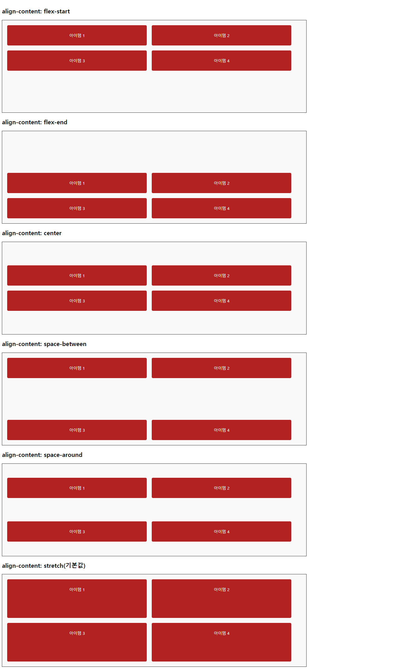 - stretch (기본값): 줄들을 Flex 컨테이너의 높이에 맞게 늘린다.