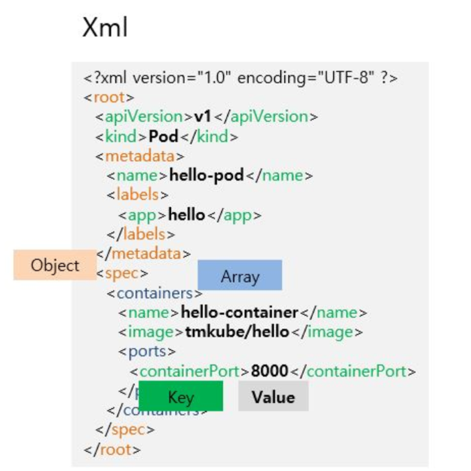 태그형식을 통해서 Key와 Value를 구분하고, 태그안에 태그를 넣어서 부모와 자식관계의 구조를 나타냅니다. 근데 위에 Object와 Array 부분은 표시를 해놨지만 Xml포맷상으로는 구분이 안되는 부분도 있습니다.