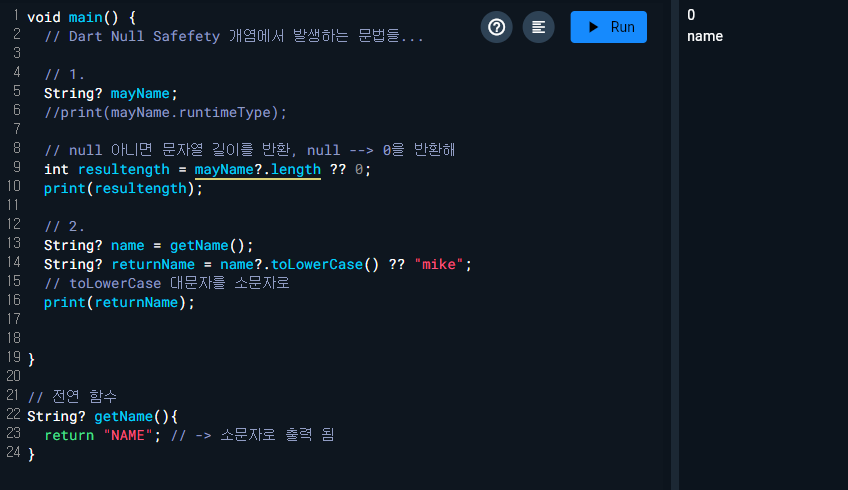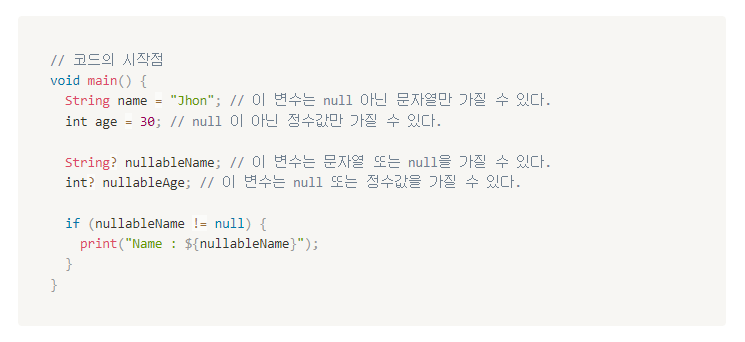 - Null Safety는 변수에 null 값을 할당하는 것을 엄격하게 제한합니다.