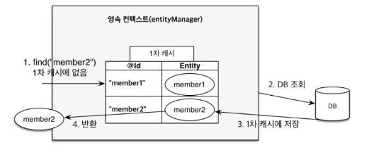 엔티티를 조회하면 1차 캐시에서 데이터를 조회하고 값이 있으면 반환합니다. 값이 없으면 데이터베이스에서 조회해 1차 캐시에 저장한 다음 반환합니다. 이를 통해 데이터를 조회할 때 데이터베이스를 거치지 않아도 되므로, 빠르게 데이터를 조회할 수 있습니다.