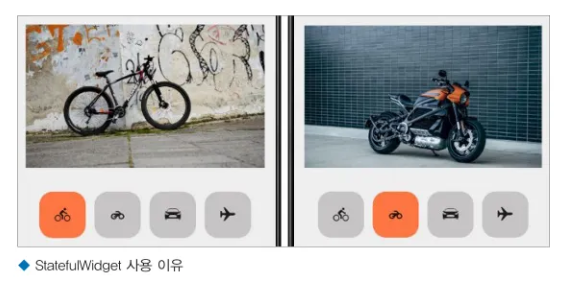 // StatefulWidget -> ๋์ (๋ฒํผ ํด๋ฆญํ์ ๋ UI ๋ณ๊ฒฝ)