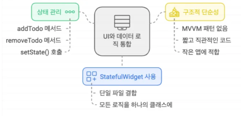 - StatefulWidget을 사용하여 UI와 데이터 로직을 하나의 파일에 결합했습니다.