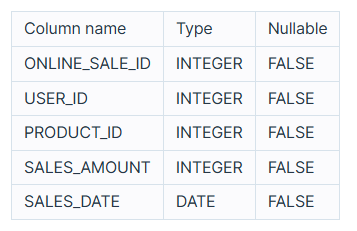 다음은 어느 의류 쇼핑몰의 온라인 상품 판매 정보를 담은 ONLINE_SALE 테이블 입니다. ONLINE_SALE 테이블은 아래와 같은 구조로 되어있으며 ONLINE_SALE_ID, USER_ID, PRODUCT_ID, SALES_AMOUNT, SALES_DATE는 각각 온라인 상품 판매 ID, 회원 ID, 상품 ID, 판매량, 판매일을 나타냅니다.