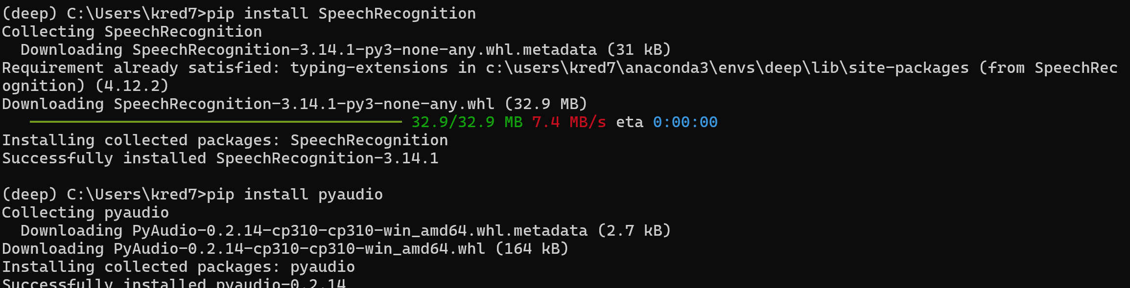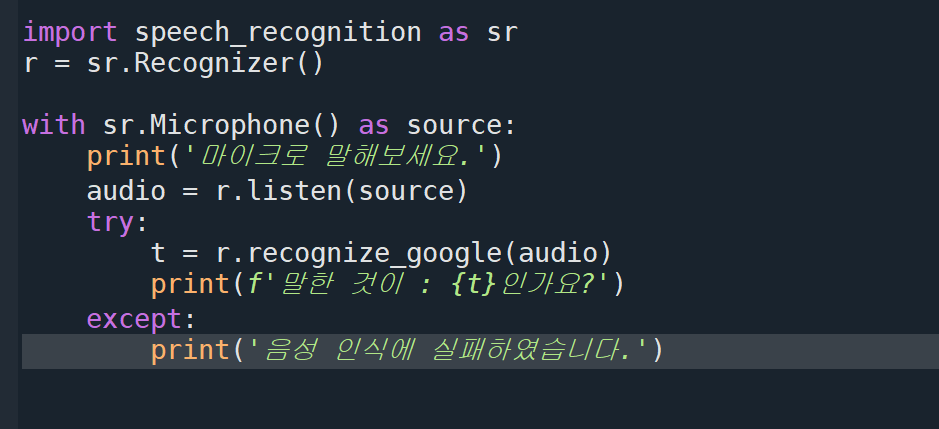 음성을 인식하여 텍스트로 만들어주는 라이브러리들을 설치하고 예제 프로그램을 실행해보자.