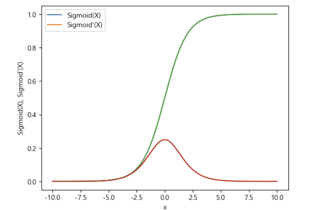 시그모이드 함수(Sigmoid(x))와 그 미분(Sigmoid'(x))의 그래프를 시각화하는 코드