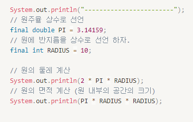 - 자바에서 상수를 선언하는 방법은 final 이라는 예약어를 사용.