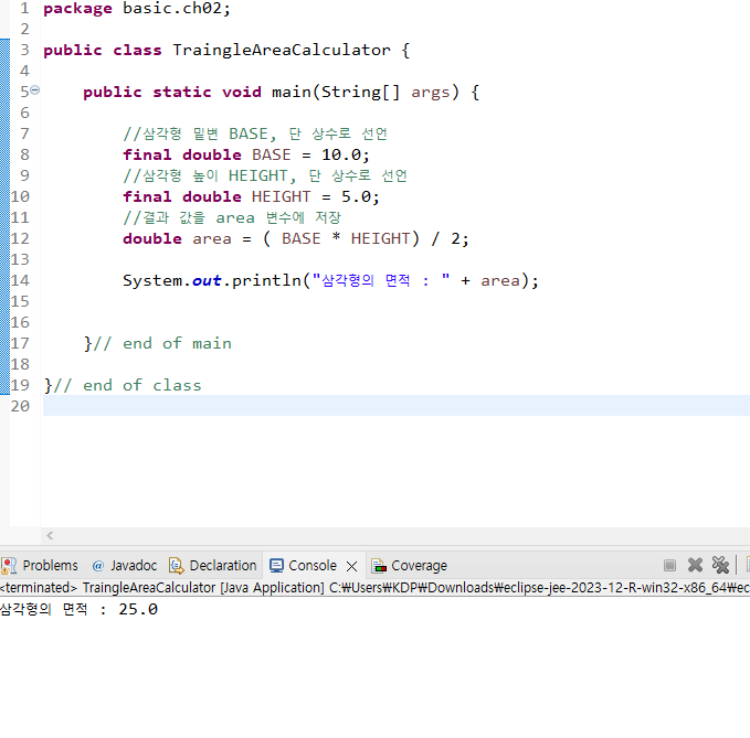 : 삼각형의 면적을 계산하는 코드를 작성해 보자.(밑변 * 높이)
