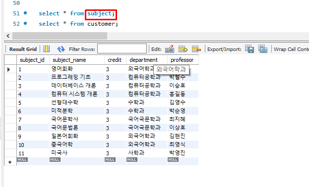 (1, '영어회화', 3, '외국어학과', '김영희'),