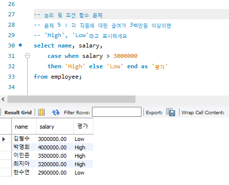 -- 문제 5 : 각 직원에 대한 급여가 3백만원 이상이면