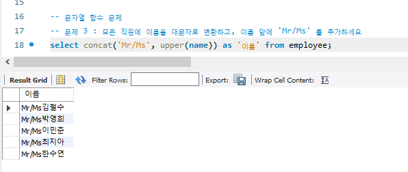 select concat('Mr/Ms ', upper(name)) as '이름'