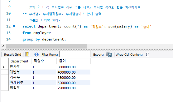 -- 각 부서별로 직원 수를 세고, 부서별 급여의 합을 계산하세요