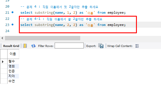 -- 문제 4-1: 직원 이름에서 끝 2글자만 추출 하세요