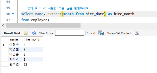 -- 문제 8 : 각 직원의 고용 월을 반환하세요.