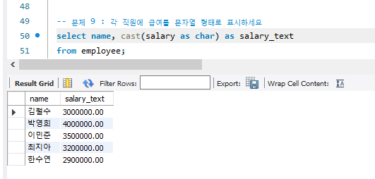 -- 문제 9 : 각 직원에 급여를 문자열 형태로 표시하세요.