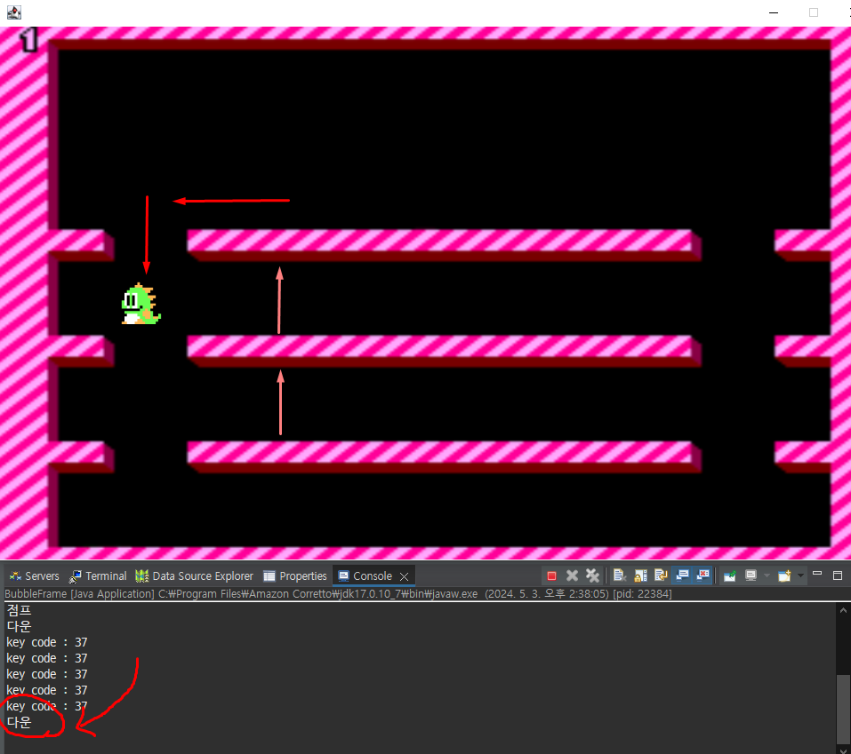 적군 생성 및 버블 수정파일 (new 파일 -> BackgroundEnemyervice, Enemy, EnemyWay)인터페이스 파일enum 파일package Bubble.ex10;import javax.swing.ImageIcon;import javax.swing.JLabel;public class Player extends JLabel implements Moveable { BubbleFrame mContext; private int x; private int y; private ImageIcon playerR, playerL; // 움직임의 상태 private boolean left; private boolean right; private boolean up; private boolean dow..